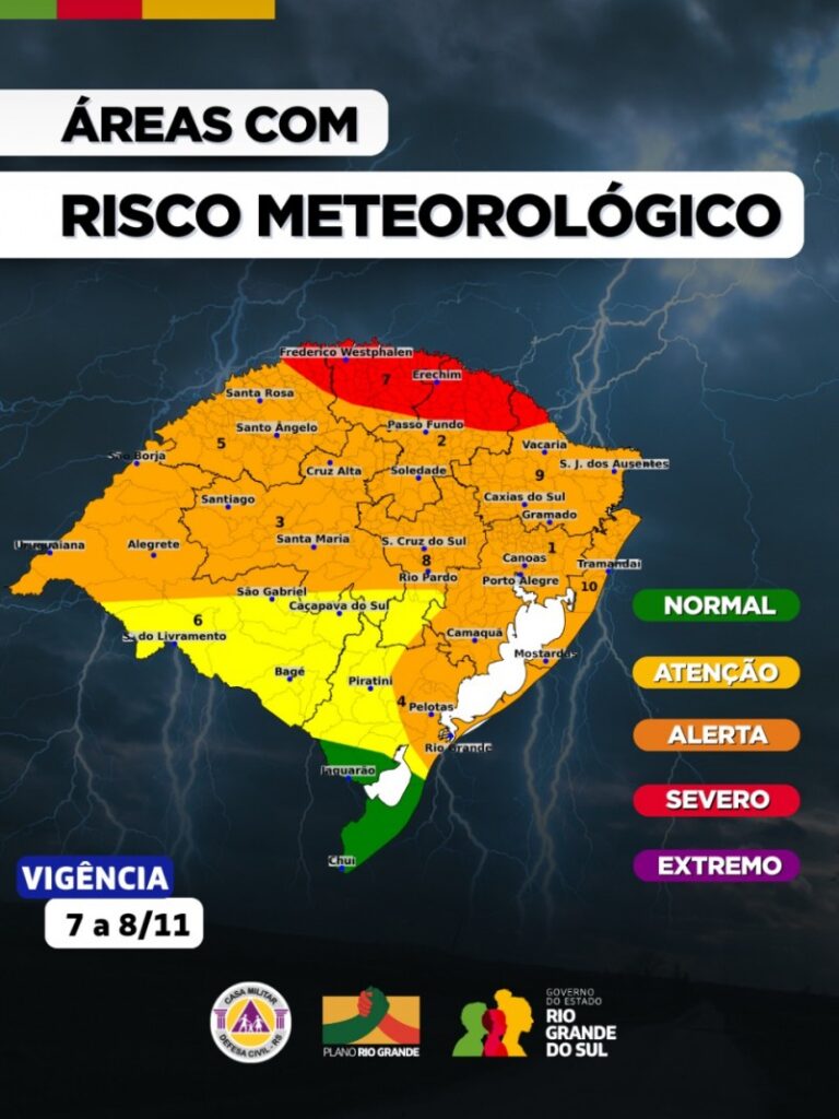 O Rio Grande do Sul enfrenta, nesta sexta-feira (7), um alerta vermelho emitido pelo Instituto Nacional de Meteorologia (Inmet), indicando situação de “grande perigo” devido à formação de um ciclone extratropical. O fenômeno deve provocar chuva intensa e ventos fortes em grande parte do Estado, com maior atenção para as regiões Noroeste, Centro, Fronteira Oeste, Metropolitana de Porto Alegre, Serra e Norte.